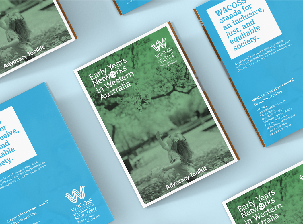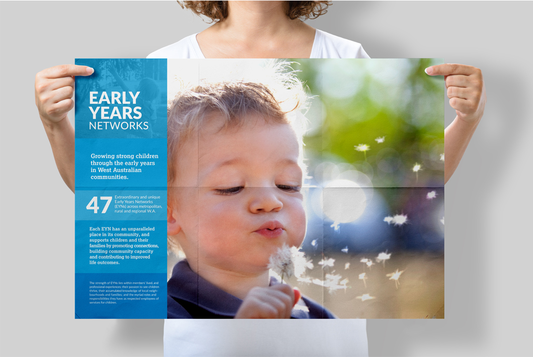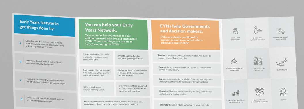 Tri-fold brochure design for Early Years Networks and WACOSS, showcasing their community impact and the benefits of joining.