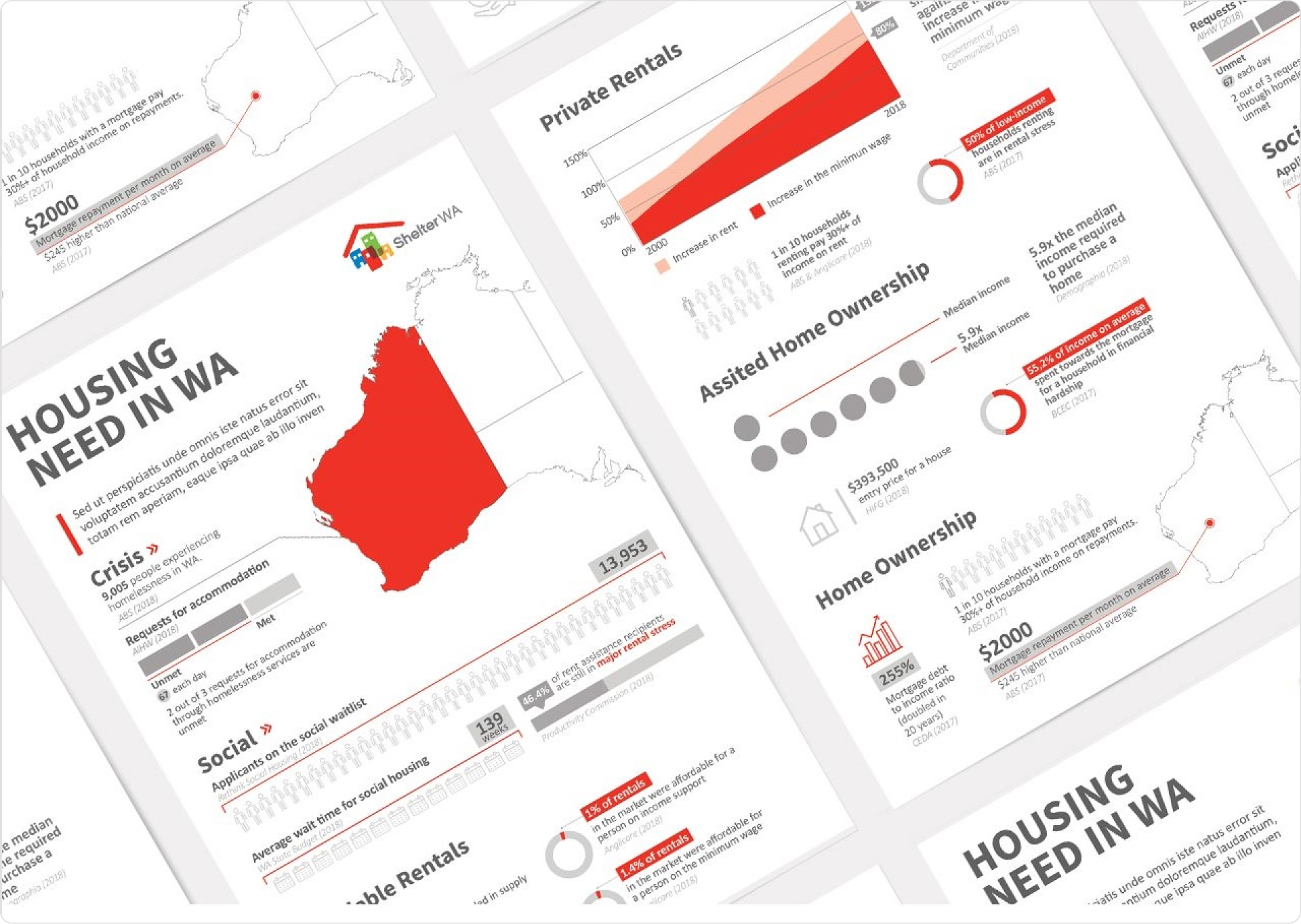 This data visualisation project was created for Shelter WA, the peak body advocating for social and affordable housing and ending homelessness in Western Australia. The objective was to communicate key data insights, supporting Shelter WA’s mission to drive systemic change and highlight the urgent need for housing solutions across the state.
